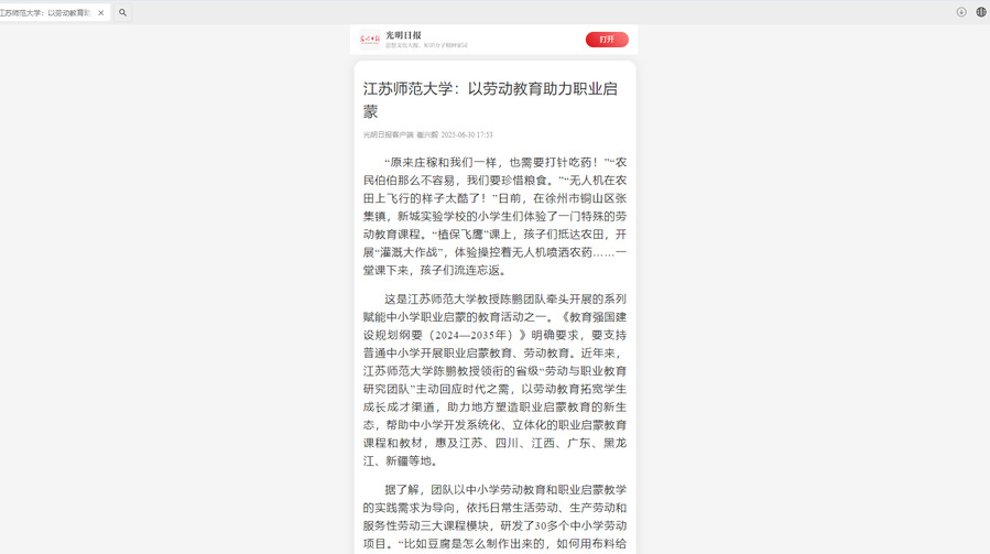 光明日报客户端6月30日报道我校陈鹏教授团队开展劳动教育研究成果,报道内容如下: